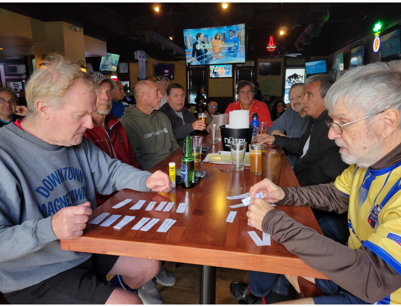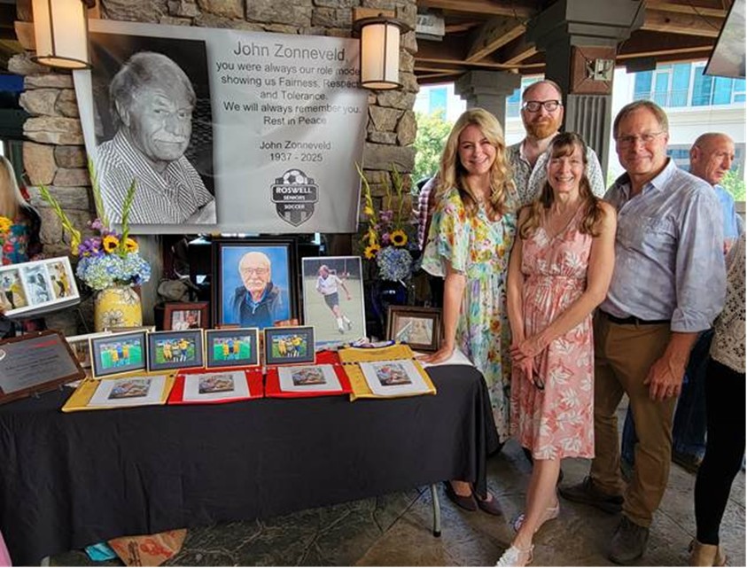 I would like to thank the players who were able to attend John's life celebration. His four children each expressed beautiful heartfelt messages about him, as did one of his granddaughters, and did a couple of his friends. Family and friends in the Netherlands were able to be there through Zoom. Fourteen of our club members were present and were able to express our condolences to John's family on the loss of their father. In the picture, you can see each of John's children, Annie, Cynthia, Ed, and Andrew. Below the banner is a photo, a jersey, and a printed document for each child.