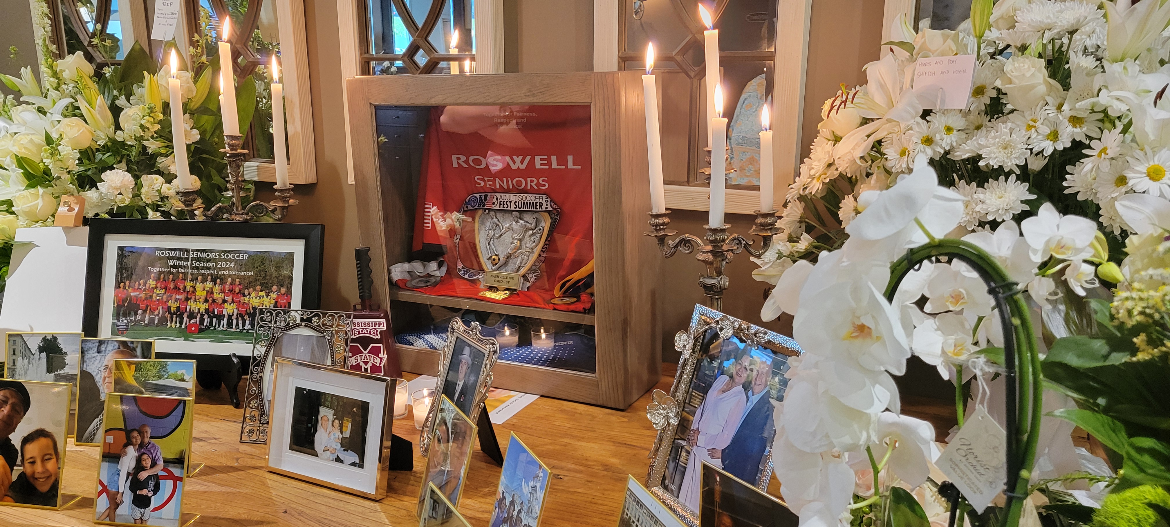 Our team photo and Ali's ROSWELL SENIORS uniform in the middle of the table at the entrance to the memorial service.